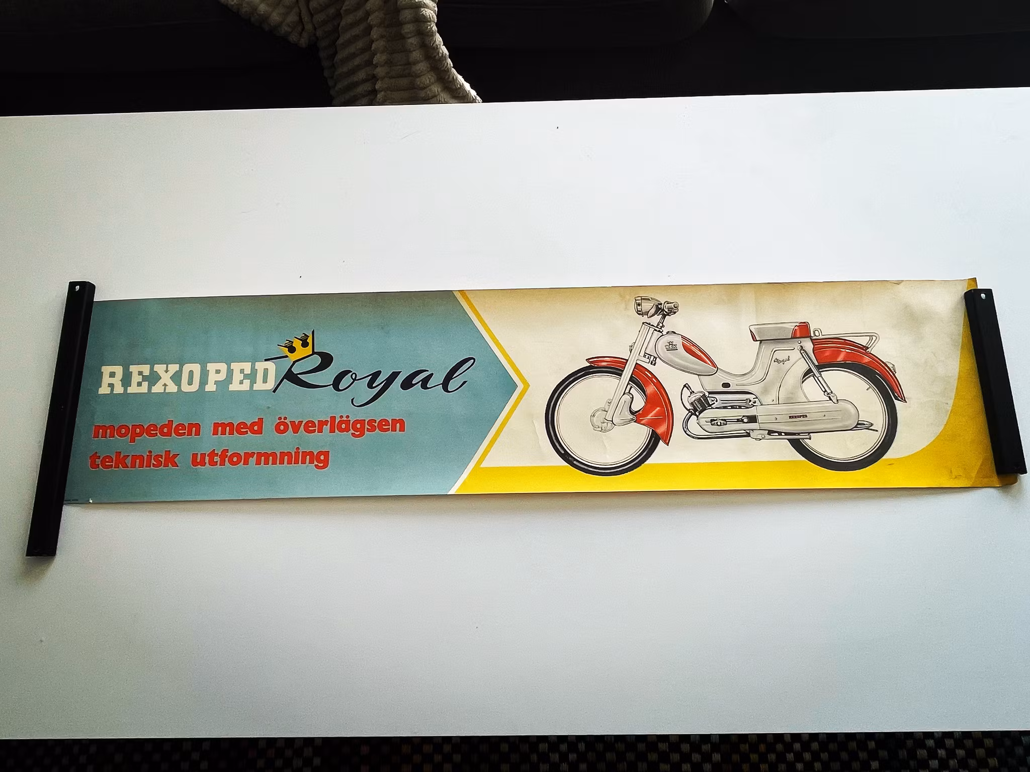 Moped reklam Rexoped Royal 50/60tal 249 kr Äldre välhållen reklamplansch som kommer från nedstängd Cykel/Mopedhandlare i Tibro. Mått: 99,5cm x 23cm Produkten är tyvärr slut i lager. Artikelnummer: 484 Leverantör: PLcollection Dela Information Äldre välhållen reklamplansch som kommer från nedstängd Cykel/Mopedhandlare i Tibro. Mått: 99,5cm x 23cm
