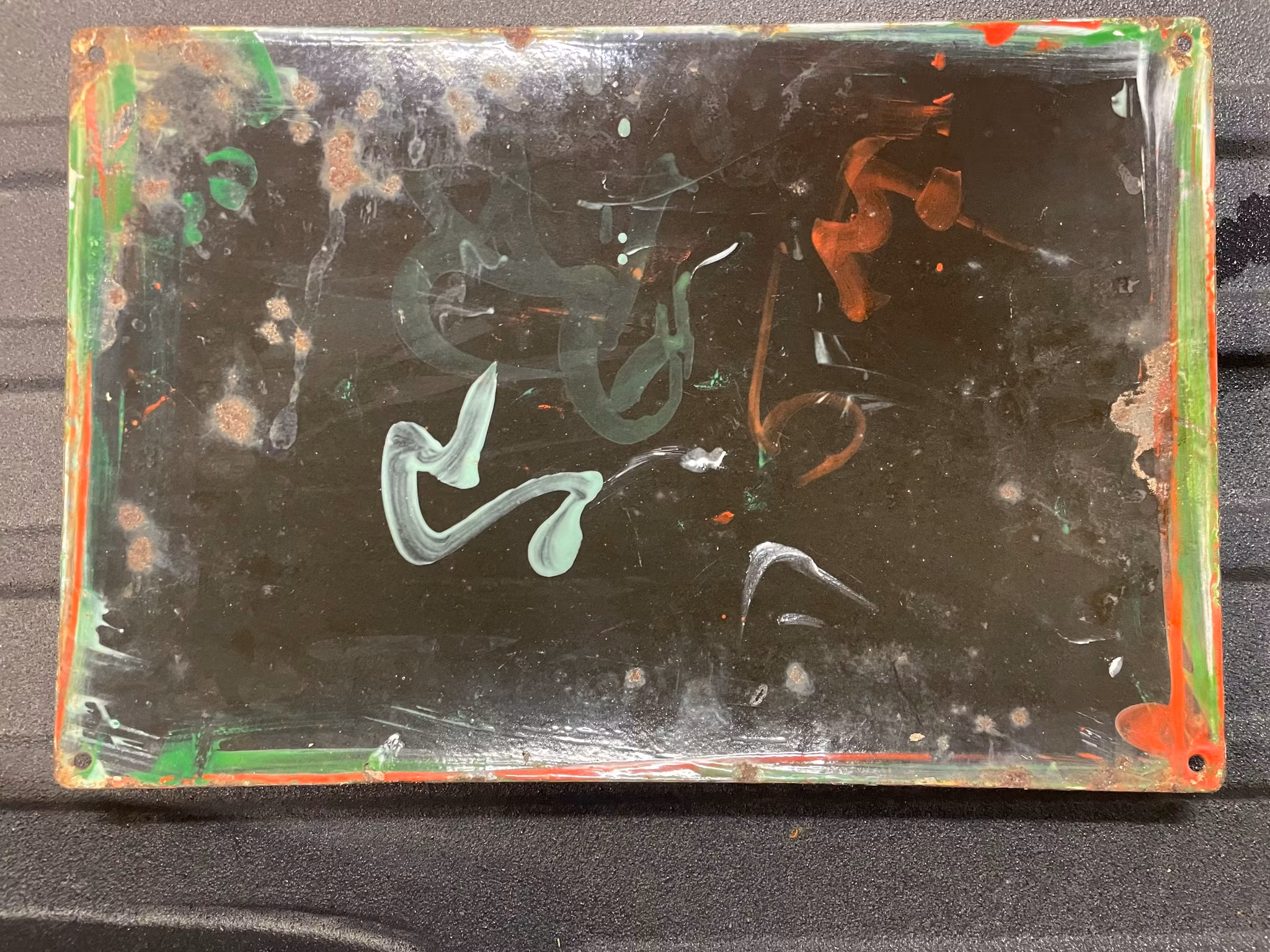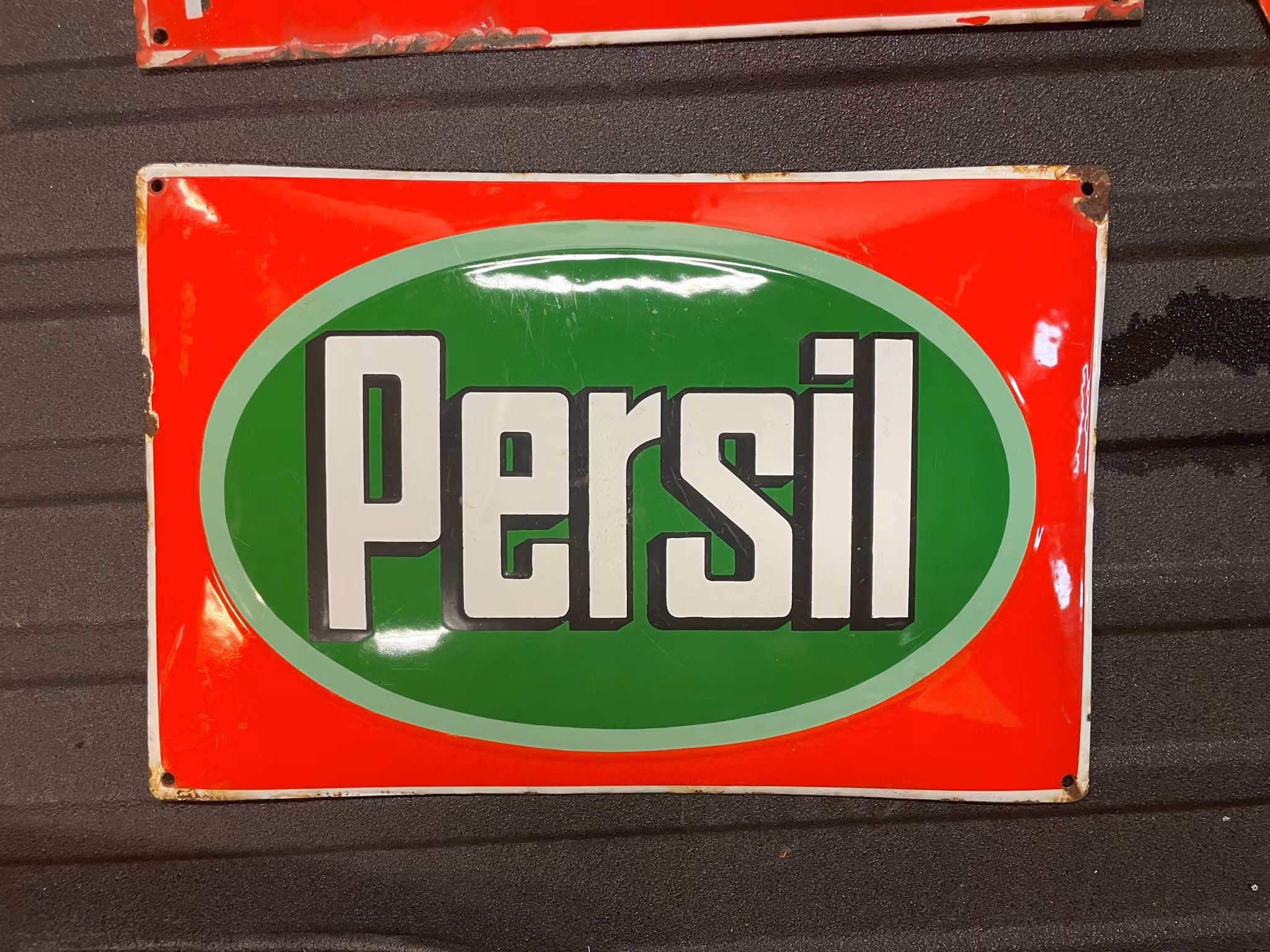 Kupad och rektangulär skylt i emaljerad plåt. Motivet är vit text ”Persil” i grön oval mot röd bakgrund med vit kant. Måtten är 445 x 295 mm.